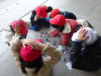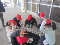 今日2年生はかるたパーティーをしました。3クラス合同でグループに分かれて、ことわざかるたを楽しみました。頭に両手を置いて、静かにことわざが読まれるのを待ちます。ことわざが読まれると勢いよくかるたを取っていました。なんと!15枚もかるたを取った子もいました!ことわざを覚えながら楽しく活動することができました。