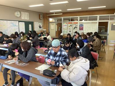 コサージュ作成では、卒業式に向けて親子仲睦まじく製作する姿が見られました。