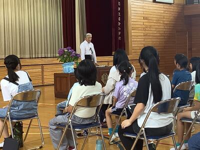 2年生・3年生:道徳 先生の読み聞かせ。お話に引き込まれています。