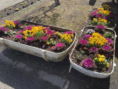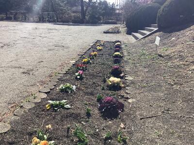 ボランティアの方がパンジーや葉ボタンの苗をたくさん持ってきてくださり、少しさびしかった(予算の関係です・・・)プランターや花壇に植えてくださっていたのです。
