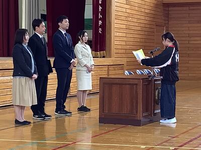 1年生と5年生の児童が代表として、「1年間を振り返って」作文発表をしました。
