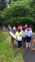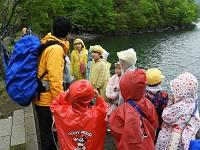 船が着くと、サーッとさらに細かな雨が・・・。バスの中で合羽を着て、次は自然探索です。日光自然博物館のネイチャーガイドのお二人と、2班に分かれてハイキングを行いました。オオルリの声に耳を傾けたり、ブナの木を触ってみたり、美しいゴヨウツツジの花の香りをかいだりしました。珍しいエゾハルゼミの抜け殻も発見しました。子どもたちは、眼を輝かせて様々なものを観察していました。