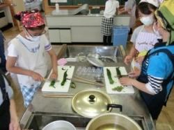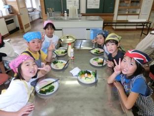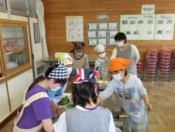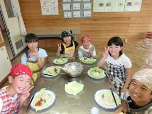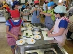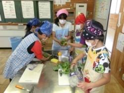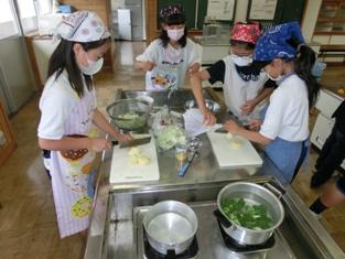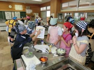 11月25日(金)の3・4校時、チャレンジ学級の子どもたちが、農園で育てたサツマイモ、大根、ハヤトウリを使って料理に取り組みました。子どもたち一人一人が役割を分担しながら、野菜を包丁で切ったり、ピーラーで皮をむいたり、煮たり焼いたりしました。メニューはサツマイモのレモン煮、大根のハムサラダ、サツマ汁、大根の油あげの炒めもの、ハヤトウリの挽き肉炒めです。みんなで作った料理は、給食と一緒おいしくいただきました。