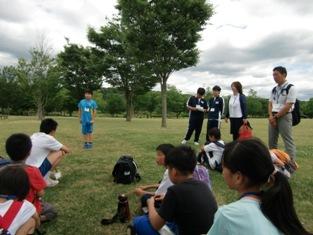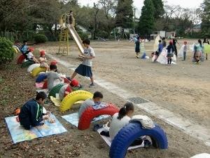 昼食は環境学習センター横の芝生にて。いつの間にか芝滑りが始まりました。