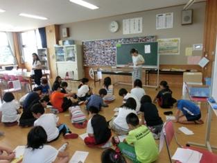 3・4年生は利根川先生、竹原先生。紙芝居「きんいろのさかな」