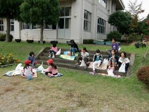 10月19日(水)に交流野外給食を行いました。縦割り班で給食を食べることで、異学年の人たちとのふれあいを深めるとともに、協力して楽しく食事する態度を育てることをねらって行いました。子どもたちは、班ごとにぞれぞれの場所を決め、楽しそうに食べました。給食後には縦割り班でいろいろな遊びを楽しみました。思い出に残る交流野外給食でした。