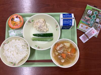 給食は、【ハロウィーン献立】でした。(ご飯、牛乳、手巻き寿司の具(ツナ・キュウリ・梅)、キムチ入り豚汁、パンプキン)