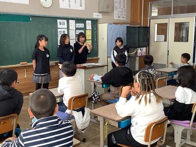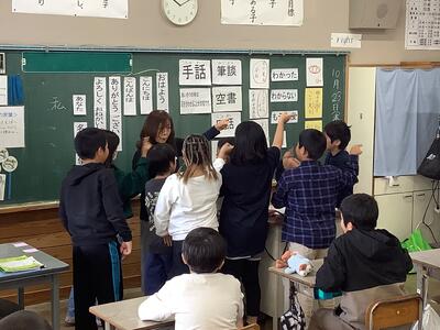 4年生が手話教室を行いました。お二人の講師にお出でいただき、聞こえない方とのコミュニケーションで大切なことや方法、簡単な手話等を教えていただきました。