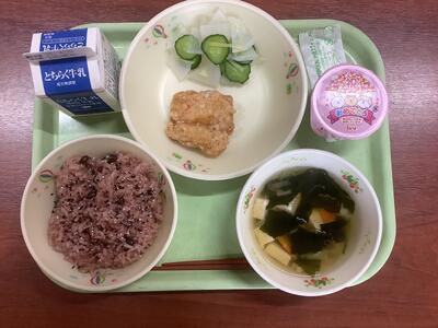 赤飯 牛乳 鶏から揚げ 大阪漬け すまし汁 お祝いいちごゼリー