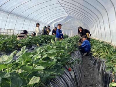 タケザワイチゴ園さんに5年生が見学に行かせていただきました。大きなハウスの中はとても暖かく、イチゴの甘い香りが漂っており、美しいイチゴがたくさん実っていました。栽培方法の工夫を教えていただいたり、イチゴの食べ比べや収穫体験などをさせていただいたりしました。食べ比べでは、甘さや食感等の違いから児童の中でも好みが分かれました。イチゴだけでなく、それぞれの良さや考え方がある。好みもそれぞれ。それらの違いを受容することの大切さも学ばせていただきました。