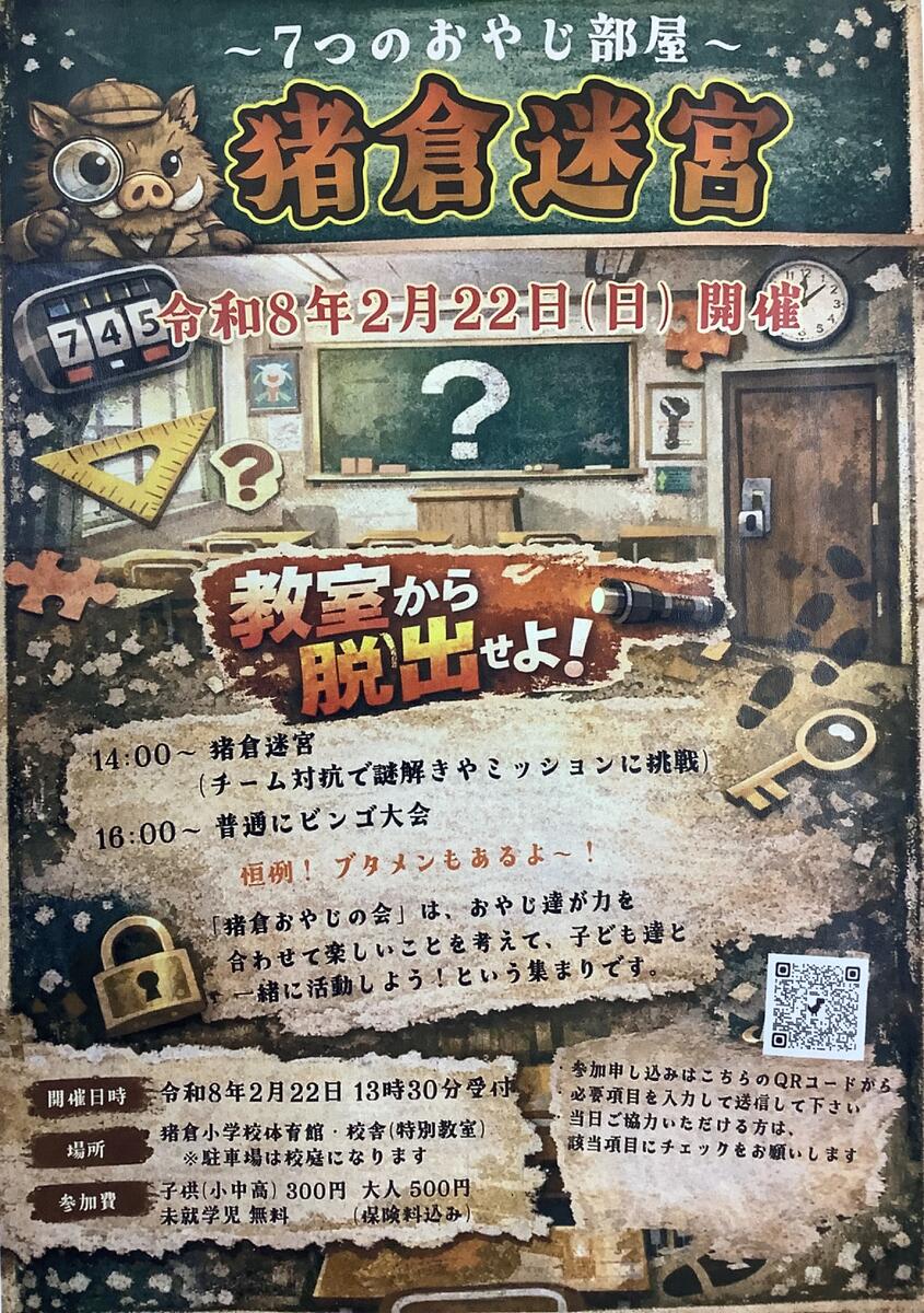 今回は『~7つのおやじ部屋~ 猪倉迷宮』 皆様、ぜひご参加ください! 詳しくは、写真又はチラシ等をご覧くださいね!