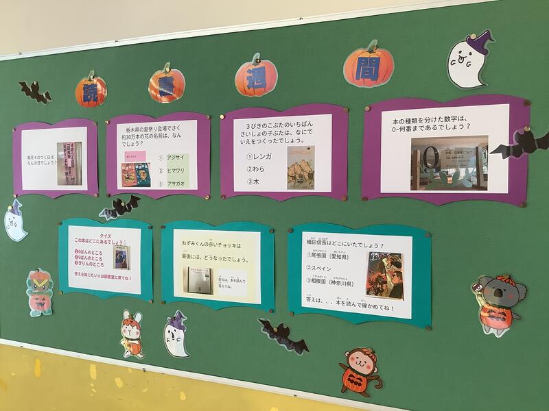 図書委員会の児童が、読書クイズを作成して掲示しています。