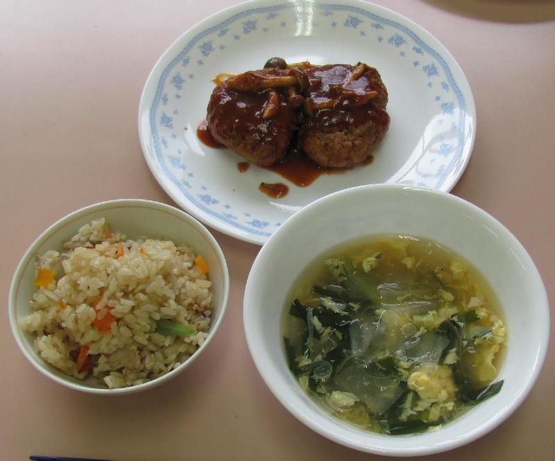 ご飯、牛乳、おろしハンバーグ、ごぼうサラダ、ワンタンスープ