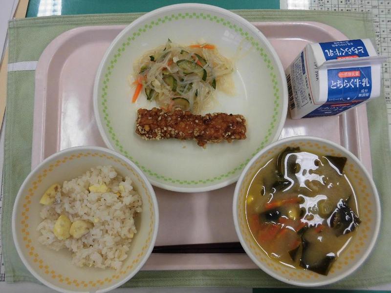 わかめ飯、牛乳、鶏肉レモンソース和え、春雨サラダ、みそ汁