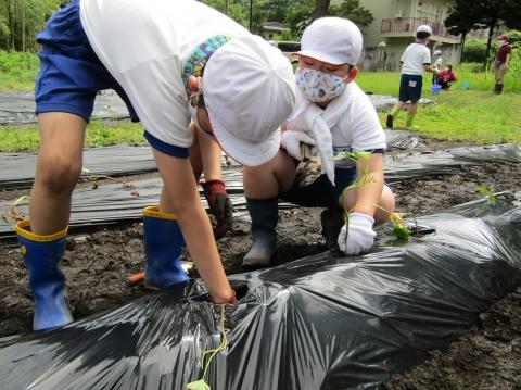 どんな芋が出てくるかな? 蔓をたよりに掘り進めます。マイチャレンジの栗山中学校の生徒も一緒です。