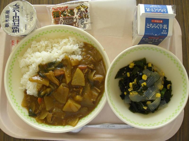 麦 ご飯、牛乳、夏野菜カレー、海藻サラダ、福神漬け、パイン