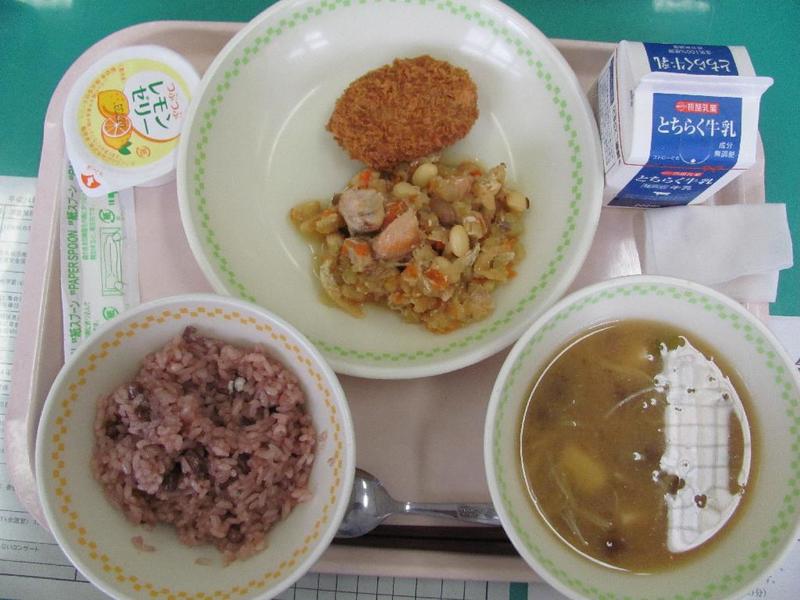 ご飯、牛乳、あじレモンじょうゆ煮、ごぼうサラダ、さつまいも汁、味付けのり