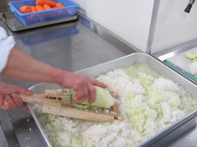 ? にんじん、だいこんはいちょう切り、白菜は短冊切り、かぼちゃは角切り、