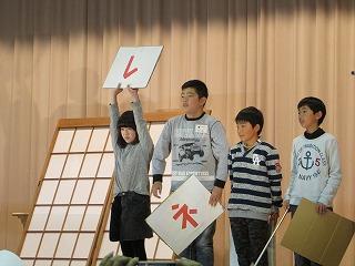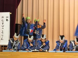 学習発表のはじめの学年は1年生です。国語の時間に勉強したいろいろな言葉遊びを、リズムに合わせて発表しました。鍵盤ハーモニカの演奏も行いました。タイトルは「あいうえおであそぼう」。楽しく元気いっぱいな発表でした。