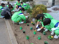 本日の放課後、今年度最後の全校緑化活動を実施し、職員室前と技術室前の花壇にパンジーを植えました。