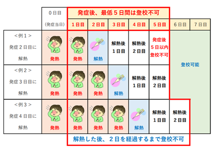 ② 出席停止期間の起点となる発症日は医師が判断しますので、受診時に確認をお願いします。