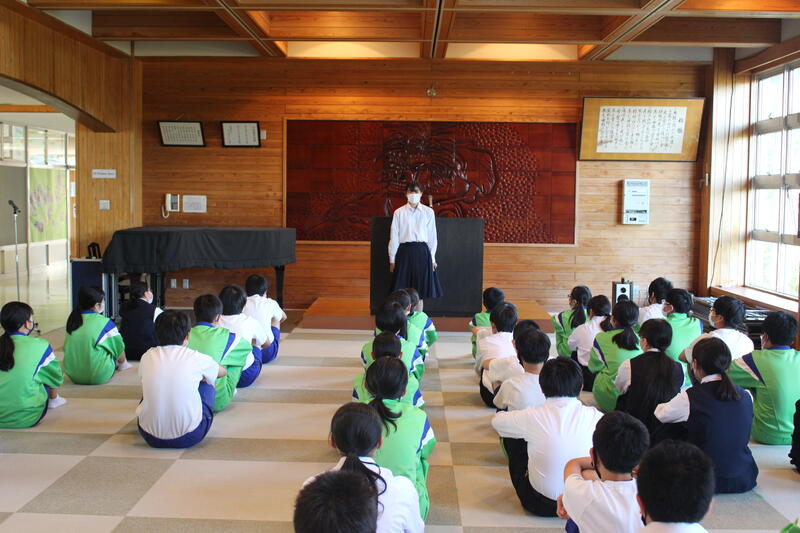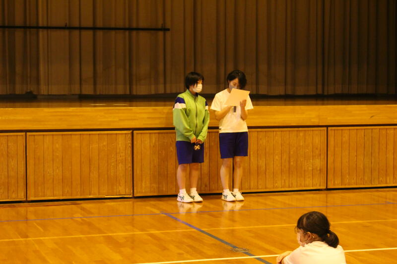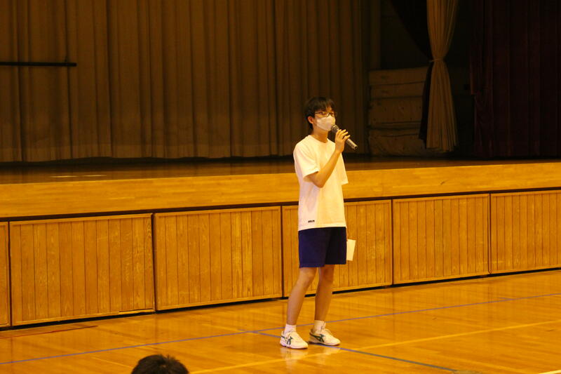 ついての作文を発表し、続いて、生徒会役員がスライドを用いて学校行事や委員会活動