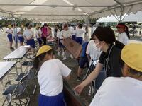 本校では、あったか交流会にボランティアとして参加し、手作りピザを提供してきました。そのため毎年、全学年でピザ作りの腕を磨いています。今回が1年生にとって初めてのピザ作りでした。なかなかピザ生地がまとまらず、膨らみもわるかったです。焼き上がり、試食。なぜかしょっぱい?!「計量を間違え」というハプニングがありました。1,3年生のピザ作りは、10月以降にリベンジしたいと考えています。