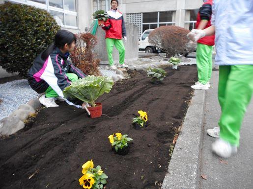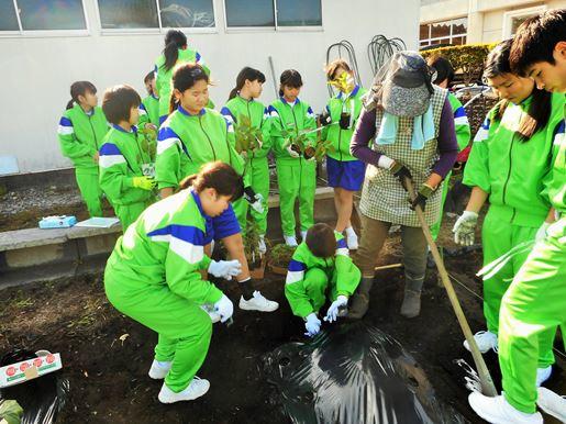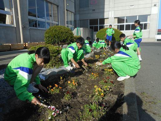 社会福祉協議会の協力の下、中学1年生が小林小学校の4年生と合同で、花いっぱい活動を実施しました。小林交差点近くにある「なかよし花壇」に、マリーゴールドやサルビアの花を数百本植えました。地域の民生委員の方たちも手伝ってくれました。