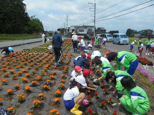 小林小4年生と小林中1年生が合同で、JA交差点近くの「なかよし花だん」で花いっぱい事業を実施しました。花は社会福祉協議会で準備してくださり、社会福祉協議会の役員、民生児童委員の方と一緒に花の苗を植えました。