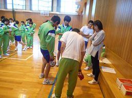 新体力テストでは、握力、反復横跳び、立ち幅跳び、長座体前屈、上体起こしを体育館で実施しました。50m走とハンドボール投げは雨のため実施せずに、後ほどシャトルランも含めて体育の時間に実施することにしました。