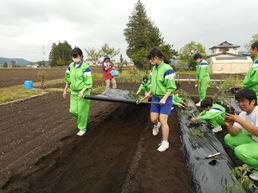 齋藤さんの指導の下、マルチを敷きました。ナス、トマト、ピーマン、トウガラシ、ジャガイモなどを植えました。