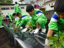 緑化活動として、学校支援ボランティアの斎藤さんのご指導の下、農園に様々な野菜を植えました。また、学級花壇の除草等の整備もしました。
