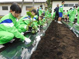学校支援ボランティアの齋藤さんに来ていただき、全校生徒で学校農園の苗植え等を実施しました。