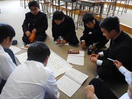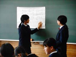 1年生音楽:男女に分かれて歌詞の意味と歌い方について話し合っている場面。