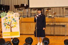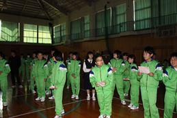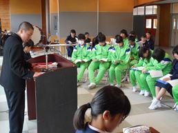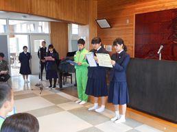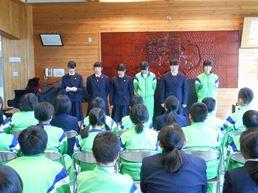 図書委員会からのベストリーダーの説明 ソフトテニス部の大会へ向けた決意発表