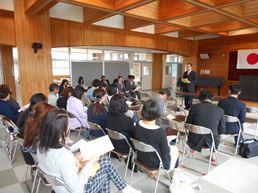 多目的スペースで生徒総会を開きました。 生徒会長からの活動報告