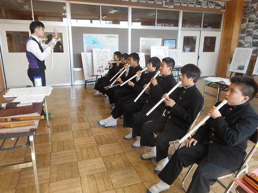 和久文子先生(琴)、前川智世先生(十七絃)、福田智久山先生(尺八)の先生方に来ていただき、1年生が邦楽スクールコンサートを実施しました。