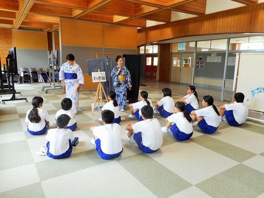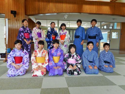 田澤ひめ先生(ハクビ京都きもの学院講師)と上吉原美知代先生(学校支援ボランティア)のお二人にお越しいただき、日本の伝統文化に触れるという目的で、浴衣着付け教室を実施しました。