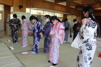 1年生の家庭科の学習の一環として、講師を招き、浴衣の着付け体験教室を行いました。着物や浴衣にもTPOがあることや日本各地の布地などについて学んだ後、実際に浴衣を自分で着てみました。日本の伝統である和装の文化に触れるよい機会となりました。