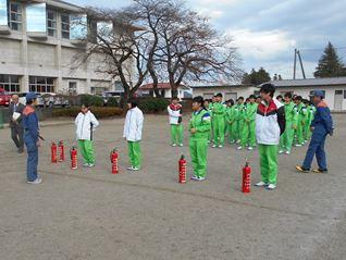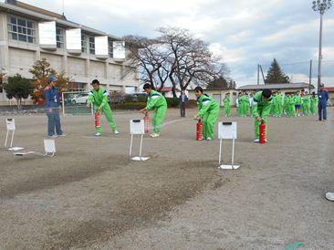 火災発生を想定した避難訓練を実施しました。今市消防署員の方に来ていただき、水消化器による消火訓練を全生徒が実施しました。