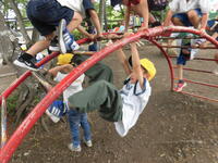 家から持ってきた容器を使い、水鉄砲で遊んだり、うちわでシャボン玉をつくったり、オリジナルの遊び道具を試してみたりして、全身びしょ濡れになり、夏の遊びを思い切り楽しむことができました。