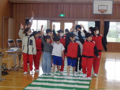 最初に全体で集まり、その後は班毎に各教室に分かれて練習しました。どの教室でも、6年生が、下級生に動きのこつを伝えながら練習する姿が見られました。それが自然にできていることから、子どもたちに伝承の文化が根付いていることを感じました。
