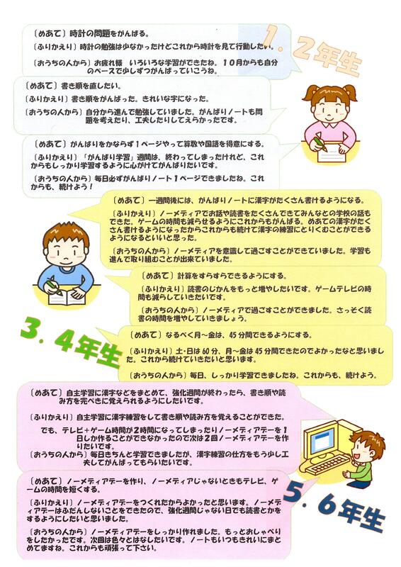 この度「未来がんばり学習表」(9月)を提出していただきありがとうございました。御家庭の御協力に感謝申し上げます。さて、めあてに少しでも近づくことがきれば,自信につながると考えております。各学年から提出された「未来がんばり学習表」から「めあてとふりかえり」「おうちの人から」をいくつか紹介します。ご覧ください。