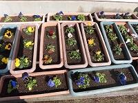 出来上がったプランター44個 パンジーの苗132個