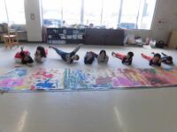 9日金曜日に校庭でローラーを使って絵の具をころころと塗った紙に、今日(14日)は手に絵の具をぬり、みんな楽しそうにぺったんとスタンプをしました。とってもおもしろい作品に仕上がりました。みんな大喜びでした。