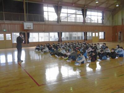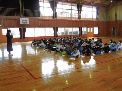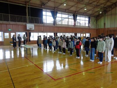コロナ流行後、しばらくの間6年教室での送る会をおこなっていましたが、今年は久しぶりの全校児童が一堂に会し体育館開催となりました。