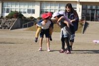 なかよしタイムは高学年と低学年が組になって一緒に遊びました。高学年は,どうすれば低学年が楽しく遊ぶことができるか考えながら内容を考えました。良い天気のもとで皆が楽しく遊ぶことができ,多くの笑顔が見られました。