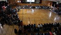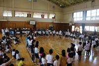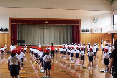 今日から9月15日(土)に行われる運動会に向けて、特別日課で全体練習が始まりました。紅白に分かれて整列し、号令に合わせて動きを練習しました。本来は,校庭でおこないますが、雨が降っていたので体育館で実施ししました。