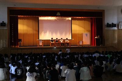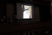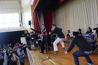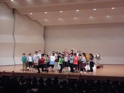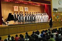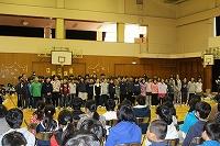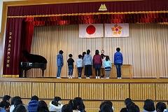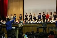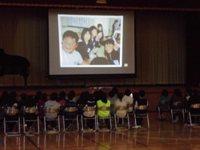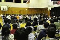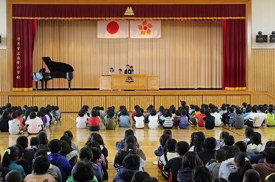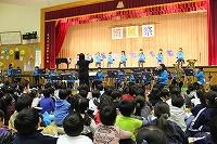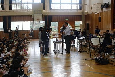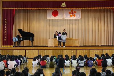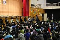 はじめに,日頃から頑張って練習をしているブラスバンド部による発表がありました。迫力のある生演奏が体育館に響き渡りました。児童達は真剣に聴き入っていました。ブラスバンド部の皆さん,ありがとうございました。