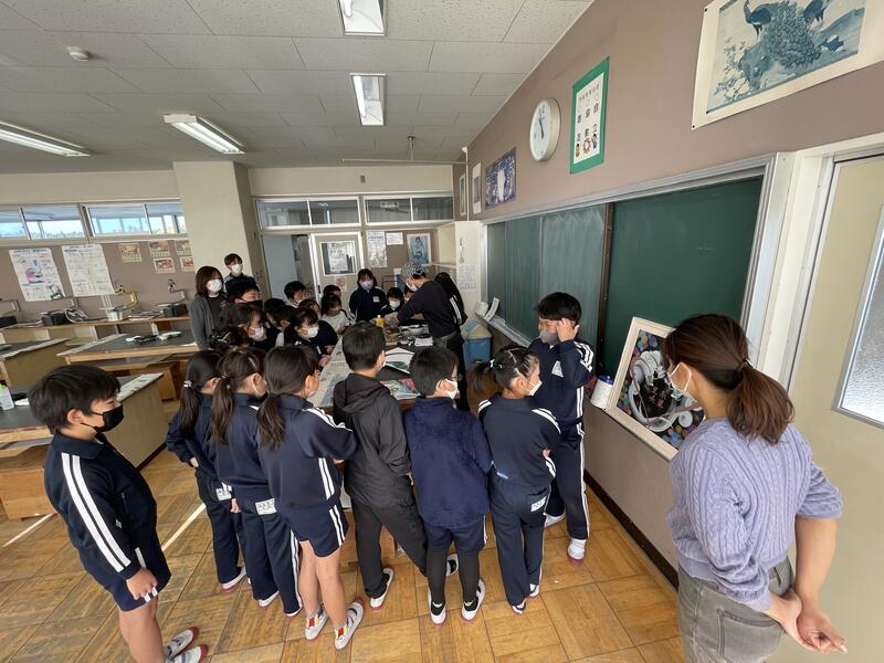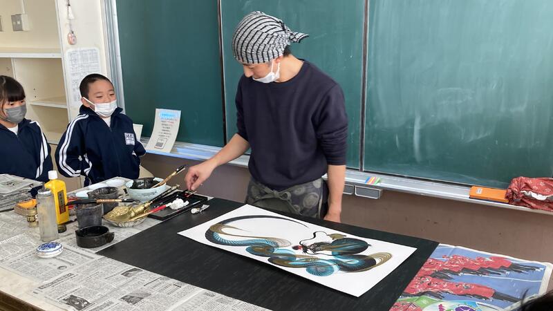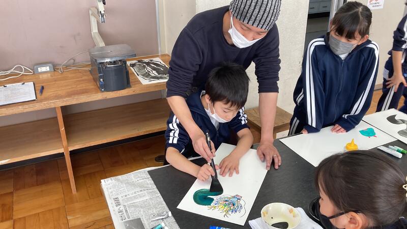 「すごい!」「難しい!」「できた!」と思い思いに話しながら楽しそうに活動していました。描き方はもちろん、筆に乗せる絵の具のつけ方にもたくさんの工夫があるそうですよ。お家に持って帰るのが待ち遠しいですね。